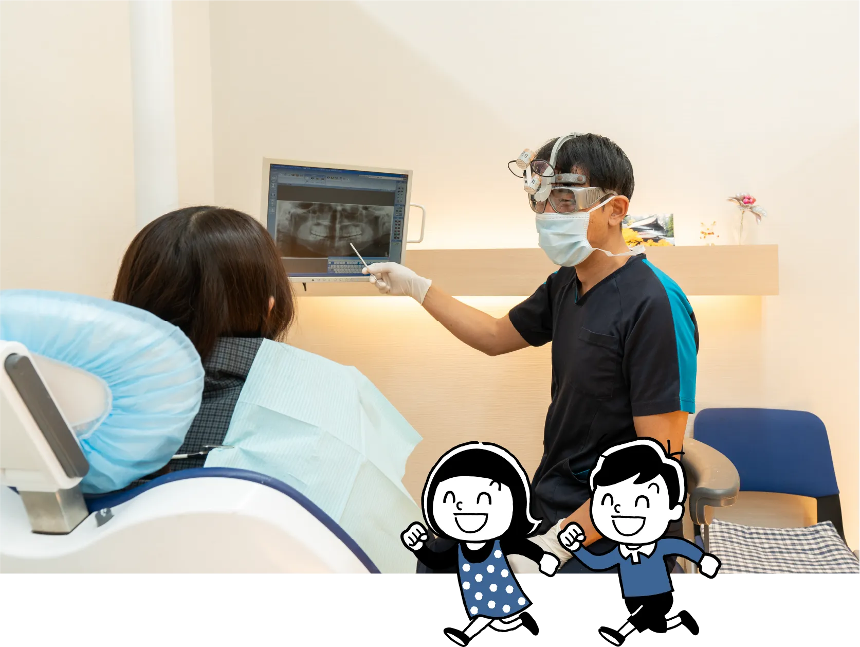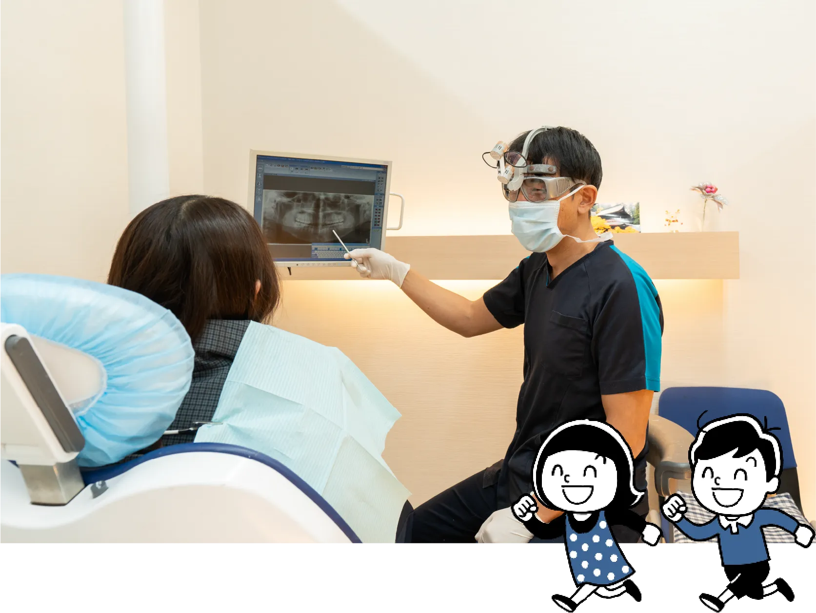 当院では患者様に不安を感じさせないよう、処置を始める前に丁寧な説明を行い、治療内容や症状を放置するリスクについて理解していただいております。 説明の際にはお口の状態や症状の原因をイメージしやすいようにお口の写真を見せながらお話しています。 目で見てわかりやすい説明を通じて少しでもリラックスして治療に臨んでいただければ幸いです。